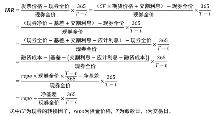 IRR的计算公式较为复杂,但经过化简,可以将其拆解为融资成本、净基差、现券全价和持有时间之间的关系式。假设现券付息频率为每年付息1次(此时区间无付息),则有: