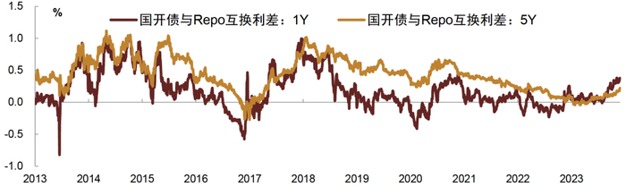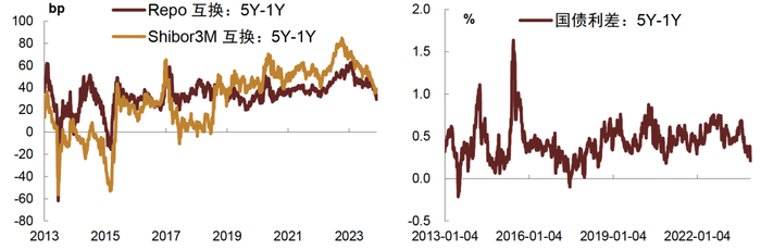 与现券套利,互换与固息券的套利空间有所抬升,1Y在30-40bp附近,5Y在10-20bp附近。