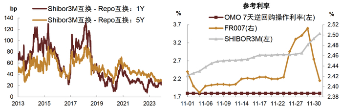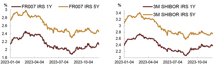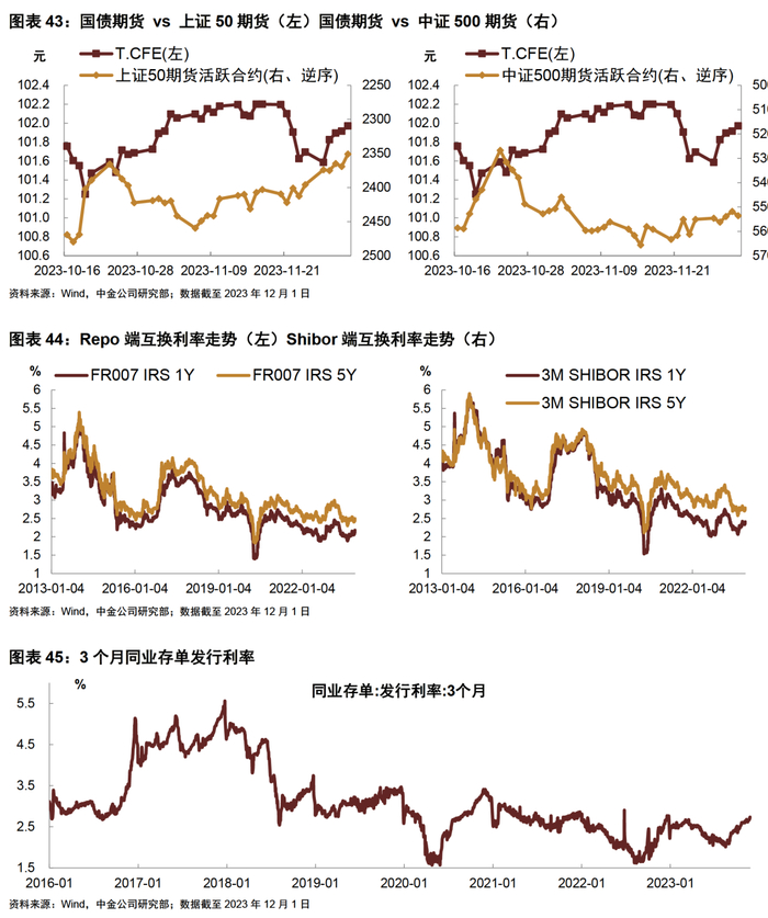 衍生品市场上,期现货走势基本一致,11月初债市利空因素减弱,中长端国债期货回涨,短端则小幅下跌,下旬开始债市再次承压,国债期货大幅回落,月末伴随资金面转松,债市情绪好转,国债期货回涨,所有主力合约均完成切换。截至12月1日收盘,TL2403、T2403、TF2403、TS2403分别收于99.4、101.97、101.85、100.978。利率互换层面,11月互换利率整体抬升,月初,随着资金面扰动因素有所减弱以及跨月影响消退,资金面转松,互换利率转降,但月中政府债券供给抬升,叠加税期影响,资金面再次收敛,互换利率反弹回升,月末最后一周央行加大呵护力度,且央行三季度货币政策执行报告中提及“稳定银行负债成本”以及“灵活有力开展公开市场操作”,资金面转向平稳。截至12月1日,Repo互换1Y端利率升至2.12%,5Y端升至2.45%,Shibor3M互换1Y端利率升至2.39%,5Y端升至2.75%。