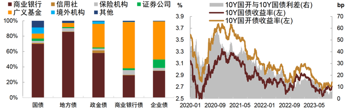 图表8:主要类别债券投资者结构(左)和国债、国开债收益率及利差走势(右)
