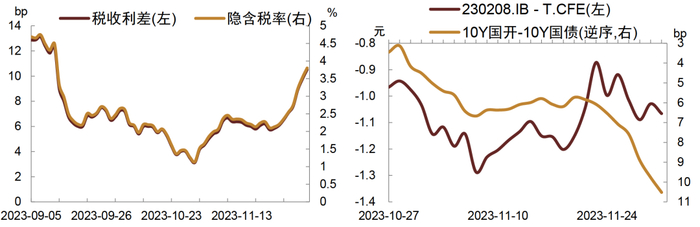 期现套利,11月IRR明显抬升,基差整体走低。10Y国开债与国债之间的税收利差和隐含税率有所抬升。