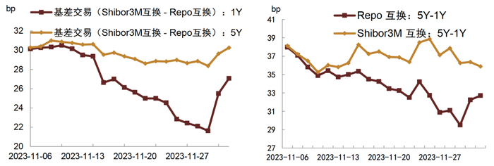 基差交易和曲线利差交易,11月互换基差整体下行,月末受跨月影响重新走扩。目前1Y、5Y对应的互换基差分别在27bp、30bp附近。曲线利差层面,Repo端整体下行,月末小幅回升,Shibor端整体震荡,二者利差分别为33bp和36bp。