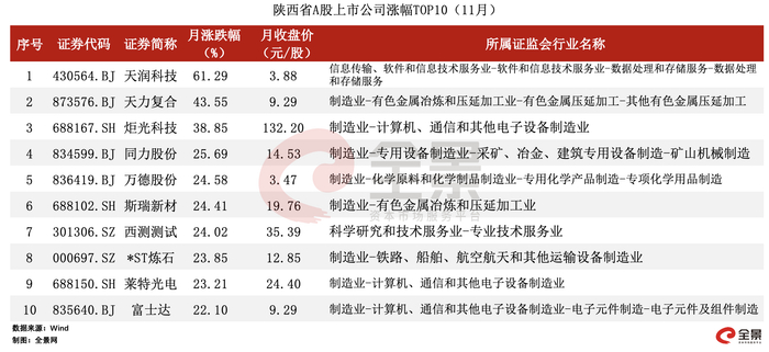 2023年11月,陕西省A股上市公司涨幅排名前10位的公司中,制造业占据8席。其中,天润科技、天力复合两家北交所企业表现亮眼,11月涨幅分别为61.29%和43.55%;炬光科技11月涨幅排名第三,达到38.85%。