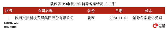 辅导备案情况看,11月陕西省共新增1家,陕西交控科技发展集团股份有限公司辅导备案材料受理。