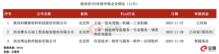 11月,陕西省IPO审核申报企业中,博大软件北交所上市委会议审议结果暂缓表决,另有两家申报北交所企业更新状态。