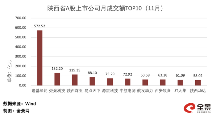 截至2023年11月30日,陕西省A股上市公司的总月成交额为2816.09亿元,较10月增加近800亿元,排名前三的上市公司分别是隆基绿能、炬光科技、陕西煤业,共约占陕西省A股上市公司的总月成交额29.12%。