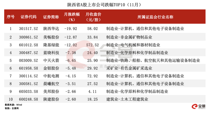 跌幅前10的上市公司中,陕西华达月跌幅居首,为19.92%,美畅股份、隆基绿能的月跌幅分别为12.87%和12.02%。