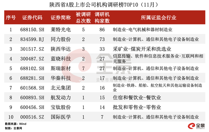 2023年11月,陕西省共有29家A股上市公司接受调研,其中,斯瑞新材被调研7次,参与机构27家;机构数量最多的为蓝晓科技,5次共计86家机构参与调研。
