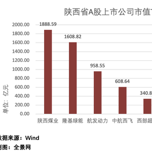 截至2023年11月30日,陕西省A股上市公司总市值为12474.9亿元,较10月增加102.17亿元,约占A股上市公司总市值的1.47%。其中,市值排名第一的公司是陕西煤业,市值为1888.59亿元;隆基绿能排名第二,市值为1608.82亿元;航发动力市值为958.55亿元,排名第三。