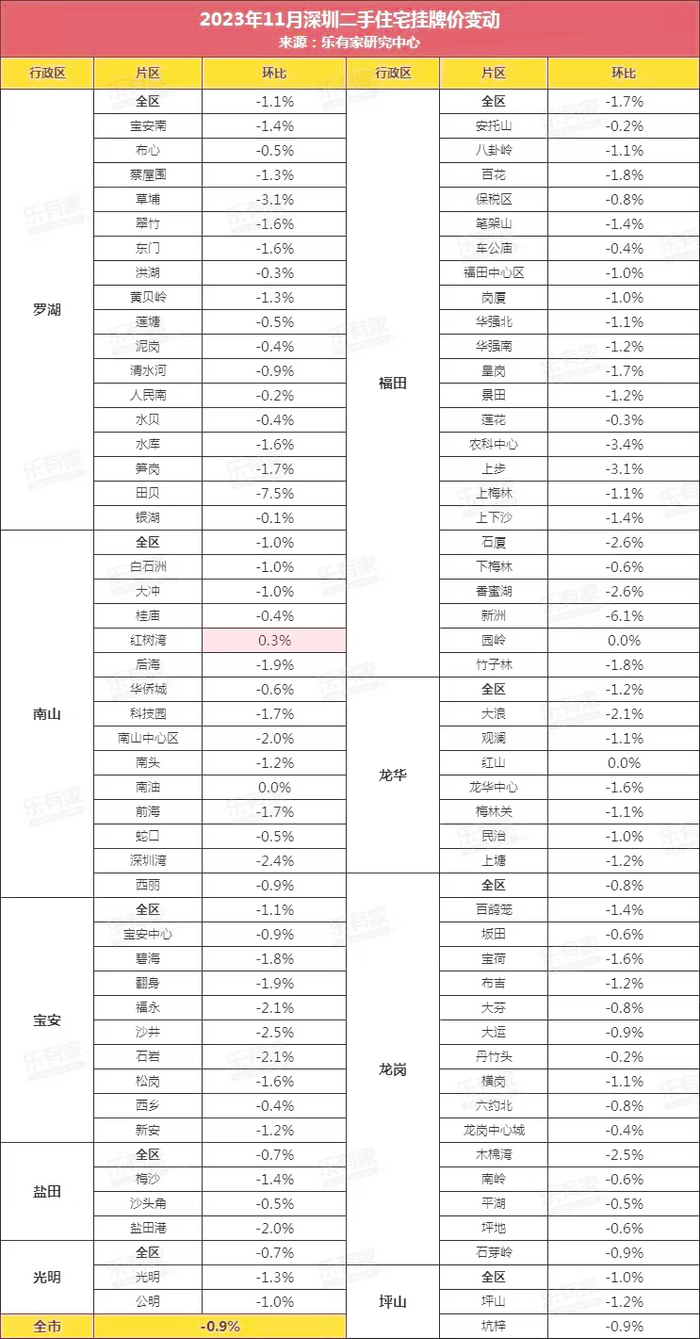 乐有家披露的数据显示,深圳目下各板块的二手房挂牌价几乎是全线下跌。