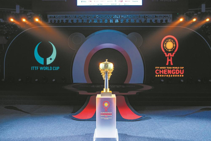 昨日,2023成都国际乒联混合团体世界杯冠军奖杯亮相四川省体育馆比赛现场,庄重典雅的造型,寓意深刻的设计激励着每一位参赛运动员,也让现场观众收到了一份意外的惊喜。