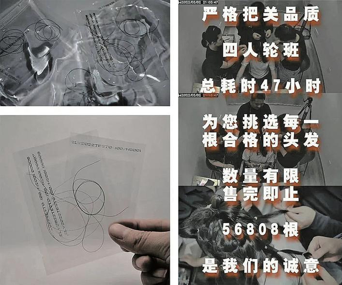 之后,佘璐芸还不断优化文案:写上“惊爆价:1毛钱”,比如“为您挑选每一根合格的头发,数量有限,售完即止”“永久头发保修,腐烂、分岔等问题终身替换”。甚至还去权威机构做了头皮检测,并加上了“通过权威头皮中心健康认证”“使用进口洗护产品定期护理”等。