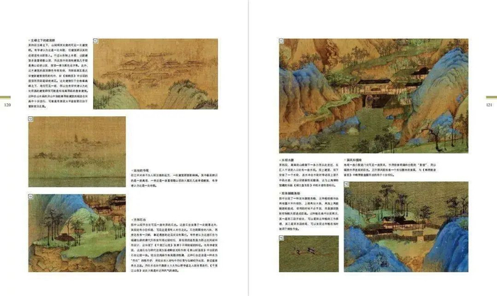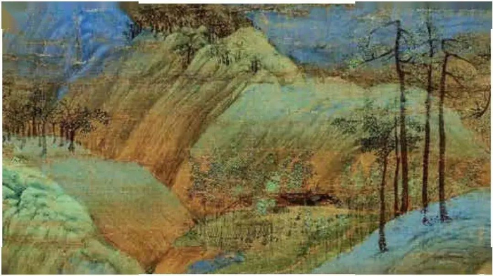 图中大量使用石青、石绿对山体、山头染色,且纯度高,敷色很厚。