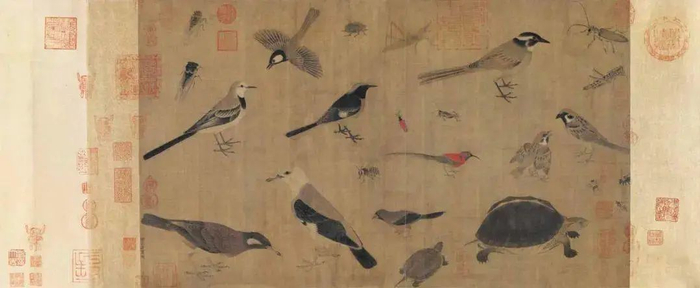 绘各类鸟虫龟类 共24只,角度各异,动态准确,特征鲜明, 可以明确辨认出所绘生物品种。