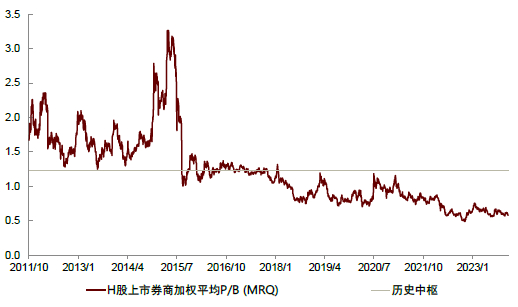 图表:当前H股券商交易于0.58x P/B,处于过去5年/10年7%/3%分位