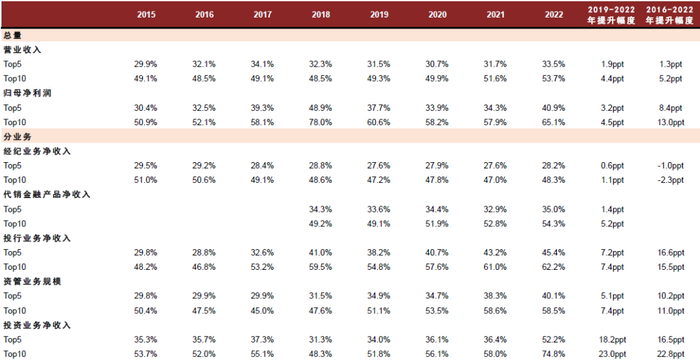 图表:证券行业各业务集中度:头部券商相关业务转型步伐更为领先,进一步强化业务竞争力、驱动集中度上行