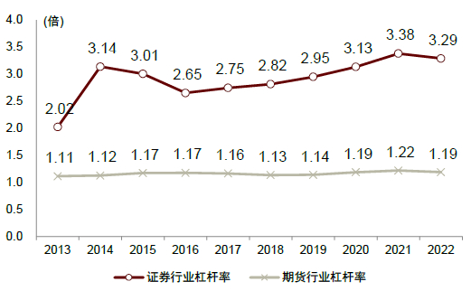 图表:伴随重资本业务不断发展,证券行业杠杆率从2013年的2.0x提升至3.3x