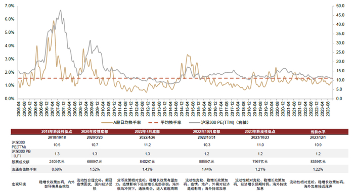 图表:A股市场当前换手率及市场估值均处于较低水平