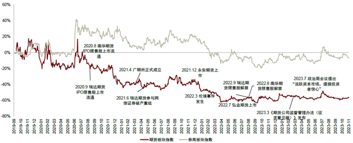 图表:期货行业股价复盘——期货行业贝塔属性较强、股价与券商行业表现关联度较高、弹性溢价有所消化