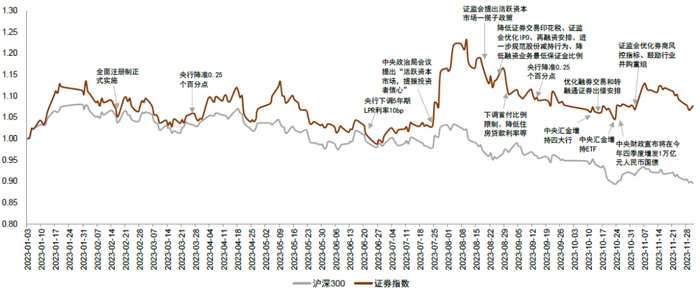► 右侧的政策:宏观层面稳增长政策、资本市场制度建设政策、证券基金行业高质量发展政策等不断出台,我们认为,政策底已现且积极的右侧信号持续强化,带动券商板块表现在3Q23率先企稳回升,相对市场(以沪深300指数为参考)具备明显超额收益。
