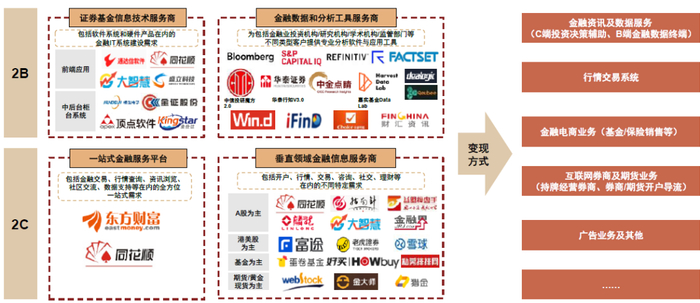 图表:国内金融信息数据服务商围绕不同客群的不同需求,形成五类主要变现方式