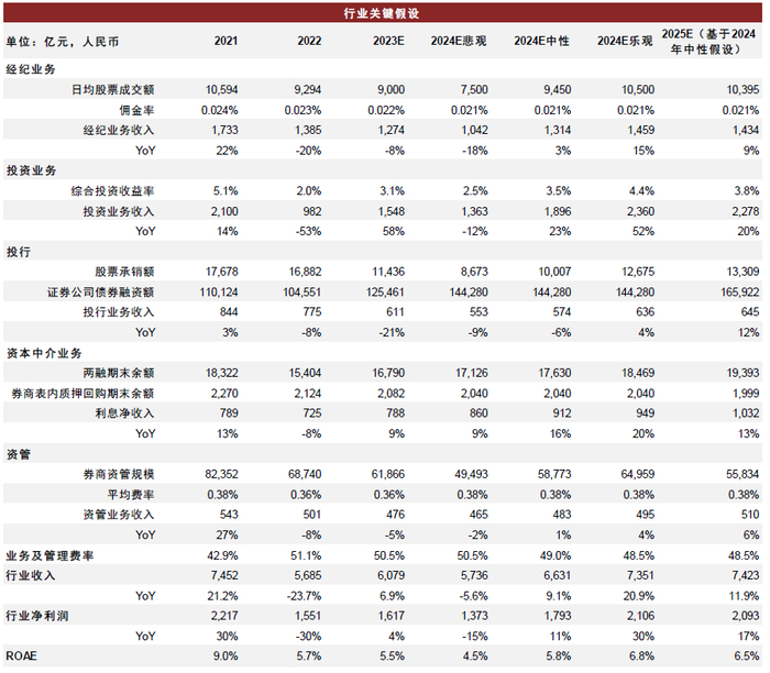 中性假设下,假设2024年A股市场日均股票成交额为9,450亿元、两融期末余额为1.76万亿元、股票融资额1.0万亿元,我们预测2024年证券行业营业收入同比增长9%至6,631亿元,归母净利润同比增长11%至1,793亿元;悲观/乐观假设下,我们预测2024年证券行业归母净利润同比分别-15%/+30%。