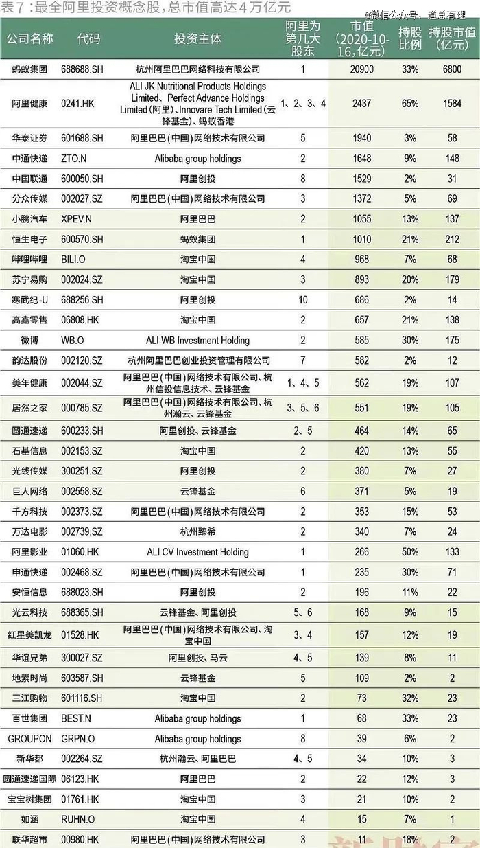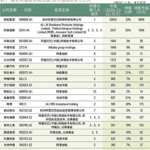 根据公告披露,目前阿里网络在A、H股还有几家上市公司持股比例超过5%,包括众信旅游(持股10.20%)、翱捷科技(持股15.43%)、联华超市(持股18%)、洪九果品(持股7.67%)、汇通达网络(持股17.26%)。