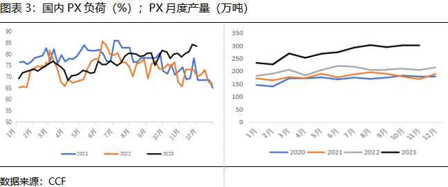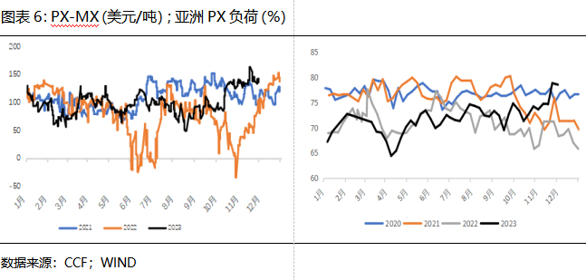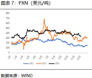 虽然三年一次的大检修已过,叠加利润尚可,国内工厂负荷将维持高位,且进口量有小幅回升预期,明年PX产量将继续增加。但受制于10亿吨炼油红线,国内落地PX和炼化一体化项目难度较大,我国PX产能扩张周期已经进入尾声。根据目前投产进度来看,2024年国内仅有裕龙石化300万吨装置投产计划,且最终能否落地还存在不确定性。然而PTA产能相对过剩,下游需求支撑较强。预计2024年PX和PXN重心将有所下移,但空间相对有限,仍处高位。