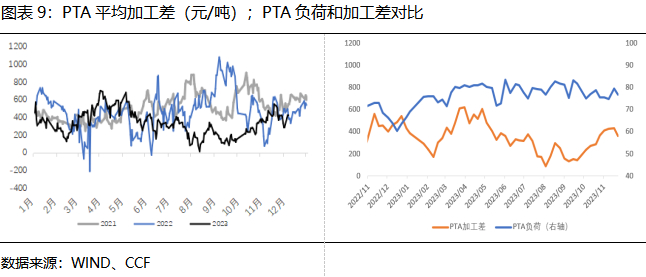 但由于目前大多PTA装置都有配套PX装置,或下游聚酯装置,实际亏损情况并非单一加工差计算所得。同时,低加工费也可以在一定程度加速行业洗牌,反而有利于部分大厂抢占市场份额。2023年PTA装置负荷和加工差走势分化,对利润敏感性下滑。1-11月PTA平均负荷为77.73%,同比高4.88个百分点。