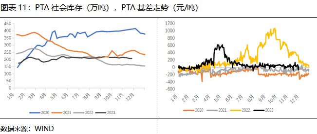 分阶段看,2月下旬开始,因PX装置陆续检修,原料供应受限,叠加TA加工差低位,工厂降负,供应缩减,且下游聚酯需求逐步恢复,PTA供需格局趋紧,基差低位回升,5月时最高600元/吨。之后虽然聚酯负荷一直维持在偏高水平,但TA工厂负荷提升,现货流通性较为充足,基差高位回落,基本维持在-30~100元/吨区间波动。2024年PTA新装置投产继续,供应增加,库存将继续累积,基差偏弱运行为主。