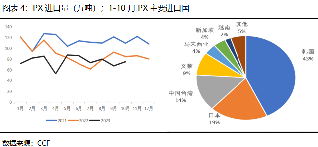 随着国内产能的增加,产量逐步提升,以及亚洲 PX 负荷持续偏低,近年来我国进口依存度不断下滑。根据海关统计数据,1-10月份,中国大陆PX进口总量761.6万吨,较去年同期较少130.26万吨,降幅为14.61%,进口依存度降至22%附近。主要进口国为韩国、日本、中国台湾和文莱。