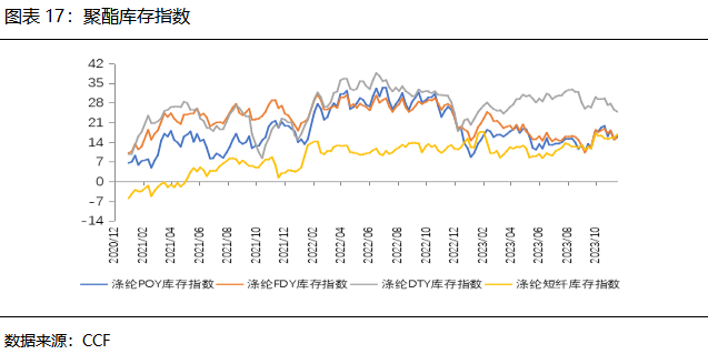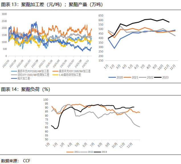由于整体效益尚可,聚酯产能投放稳步推进。截至2023年12月初,国内聚酯产能为8084万吨,较去年底新增产能930.5万吨,增速达13.01%,为近5年来高位。从项目来看,桐昆、三房巷、新凤鸣、恒逸等龙头企业是投产主力,且主要是长丝和短纤。同时,二季度后聚酯开工持续维持高位,产量呈现逐月攀升态势,呈淡季不淡局面。1-11月聚酯产量和平均负荷分别为6052万吨和87.4%,环比去年同期增长15.43%和4.28%。