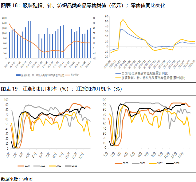 内贸方面,随着各项稳增长政策逐步发力,以及出行增加带来的纺织服装消费恢复,今年以来我国服装零售额恢复增长态势。1-10月社会消费品零售总额累计值为385440亿元,同比增长6.9%,其中服装、鞋帽、针纺织品类零售总额11126亿元,同比增长10.2%,高于社消总额增速,且较2019年同期增长4.73%。终端订单较去年稳中有增,需求提振下,江浙开机维持高位,呈淡季不淡局面。