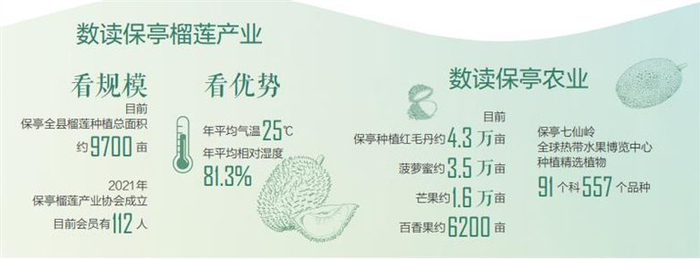 如何打造榴莲这一热带特色高效农业“新王牌”?保亭通过加强政策扶持,做好产业发展规划,建立健全榴莲产业发展体系,着力做大做强榴莲产业和榴莲品牌。