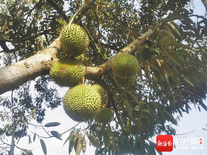 高耸的枝干上,榴莲果实三五成群地“藏在”茂密的叶片中,个头虽算不上大,却格外显眼。去年夏季,榴莲母树结束多年“空窗”挂新果。