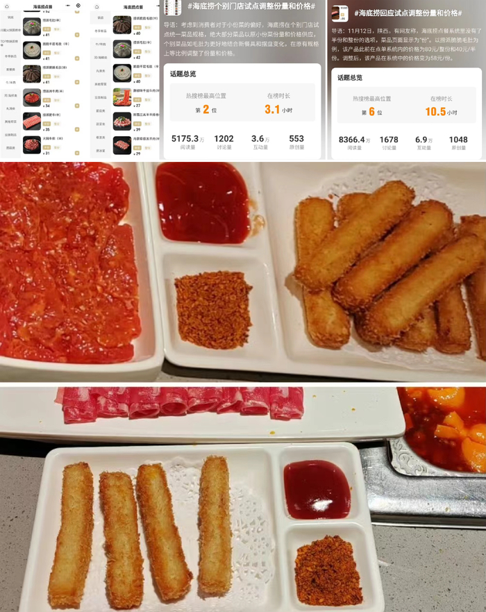随着该声音不断发酵,相关话题登上微博热搜第二位,累计阅读量冲击亿次。根据当事门店回应,称“因为顾客点半份比较多,所以门店首发实验,现在一份约等于之前的半份。”