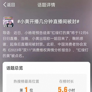 12月6日,头部主播疯狂小杨哥的徒弟“红绿灯的黄”直播间开播仅三分钟被封禁。相关话题#小黄开播几分钟直播间被封#在12月7日下午冲至微博热搜第一,截至发稿,该话题阅读量超2.2亿。