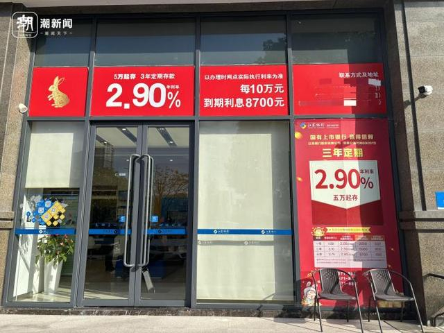 江苏银行的网点门口张贴着醒目的大红色巨幅广告,上面显示,“5万起存 3年定期存款2.9%”“每10万元到期利息8700元”的字样。凡是路过网点周边的人,很难不被吸引到。