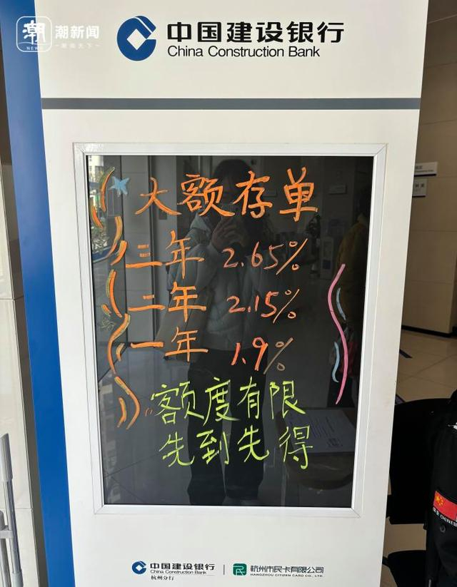 记者注意到,银行门口的业务宣传栏上写着:“大额存单:三年2.65%、二年2.15%、一年1.9%”等字样。但工作人员表示,目前只有一年期的大额存单有额度,农历新年前可能会放出三年期的大额存单,“全国人民都在抢购大额存单。”