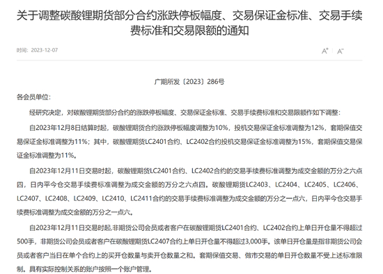 自2023年12月8日结算时起,碳酸锂期货合约涨跌停板幅度调整为10%,投机交易保证金标准调整为12%,套期保值交易保证金标准调整为11%;其中,碳酸锂期货LC2401合约、LC2402合约投机交易保证金标准调整为15%,套期保值交易保证金标准调整为11%。