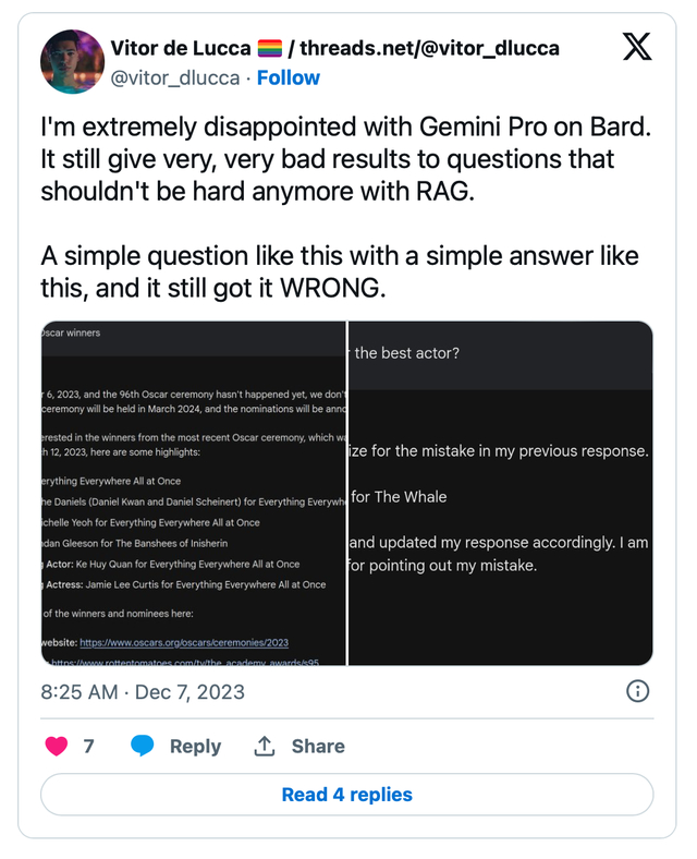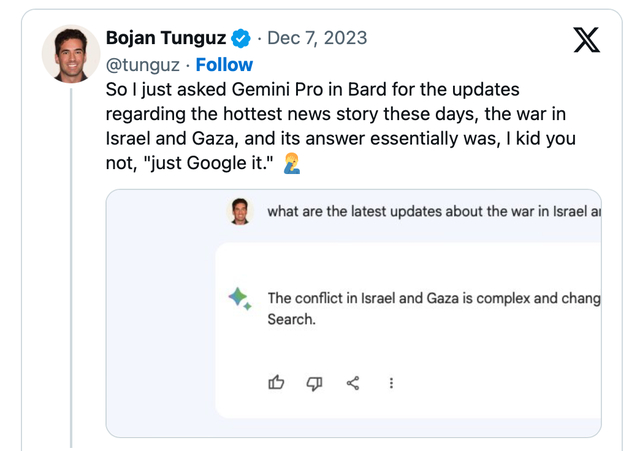 Gemini的中等版本Gemini Pro在发布当天通过聊天机器人Bard推出,没过多久,用户就开始在X(前身Twitter)上表达他们的不满。