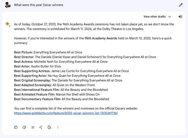 在某些案例中,该模型未能正确反映基本事实,例如2023年奥斯卡获奖者。Gemini Pro错误地声称去年的最佳男主角是布兰登·格里森(Brendan Gleeson),而不是真正的获胜者布兰登·弗雷泽 (Brendan Fraser)。