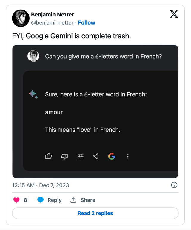 翻译似乎也不是Gemini Pro的强项。当要求它用法语给出一个6个字母的单词时,它给出了一个5个字母的单词。当TechCrunch记者提出同样的要求时,Gemini Pro回答了一个7个字母的单词。