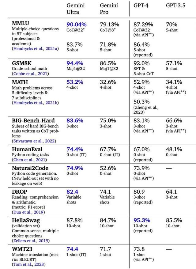 谷歌发布的表格显示了Gemini与GPT-4的对比,蓝色为获胜参数。