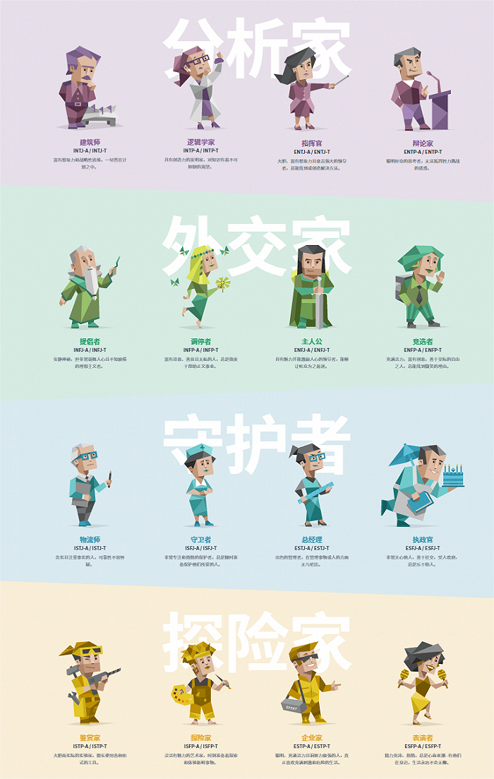 MBTI的全称是迈尔斯-布里格斯类型指标,从荣格的性格分类发展而来,在外向和内向(E和I)、直觉和感觉(S和N)、思考和情感(T和F)和判断和感知(J和P)四组维度上,将人大致划分成了16种性格类型,并赋予其身份。