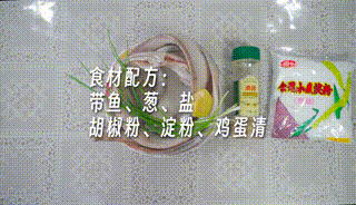 2.将葱段、姜切丝、盐、淀粉、胡椒粉、蛋清加入带鱼,搅拌均匀后静置30分钟。