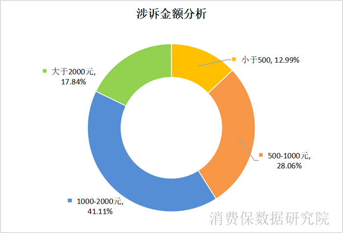 在“演唱会”相关投诉中,涉诉金额在1000-2000元以上的投诉量占比41.11%,其次是金额在500-1000元以上的投诉量,占比28.06%;金额在2000元以上的占比17.84%。