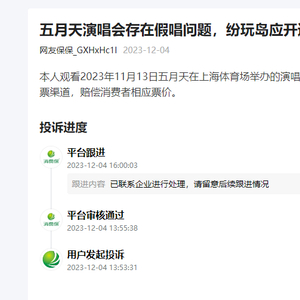 (1)演唱会存在假唱问题2023年12月4日,消费保平台某用户投诉五月天演唱会存在假唱问题。他在观看2023年11月13日五月天在上海体育场举办的演唱会以后发现其大量歌曲假唱,要求售票方纷玩岛应开通退票渠道,赔偿消费者相应票价