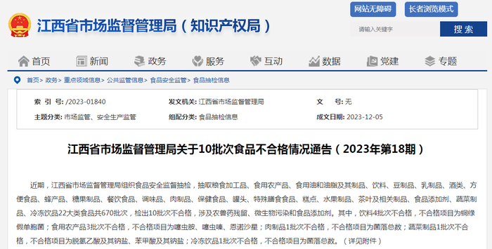 江西省市场监督管理局关于10批次食品不合格情况通告(2023年第18期)
