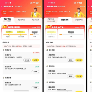 此外,为助力商家达成订单目标,成长计划迭代了首月3大阶段十余项任务的完成标准,使目标更加清晰易懂,指导效果更强。通过具体任务引导,帮助新商家优化门店基建,有效提升流量获取和转化能力,增强竞争力。新商家根据提示完成相应任务之后,即可获得对应的权益奖励,包括新店标签延长、私域粉丝群、推广费折扣等等。